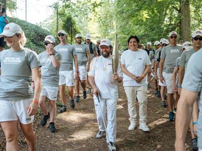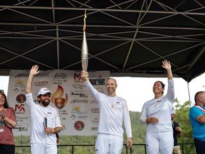 Les porteurs de la Flamme : Ranomi Kromowidjojo, Nicolas Linder et Guillaume Luneau.