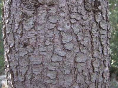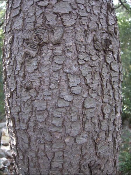 Ecorce : L’arbre possède une écorce lisse et gris clair au stade juvénile, qui par la suite se fissure et se craquelle en petites écailles brunes. Les rameaux sont longs, fins et gris jaunâtre.