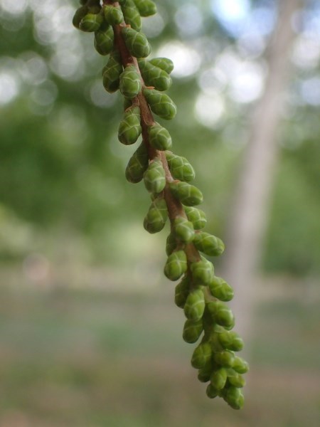 Fleurs : La floraison se déroule au printemps (mars-avril). Il s’agit de minuscules fleurs en panicules pendantes pour les mâles et des strobiles pour les femelles. Elles sont jaunes (mâle) en automne.
