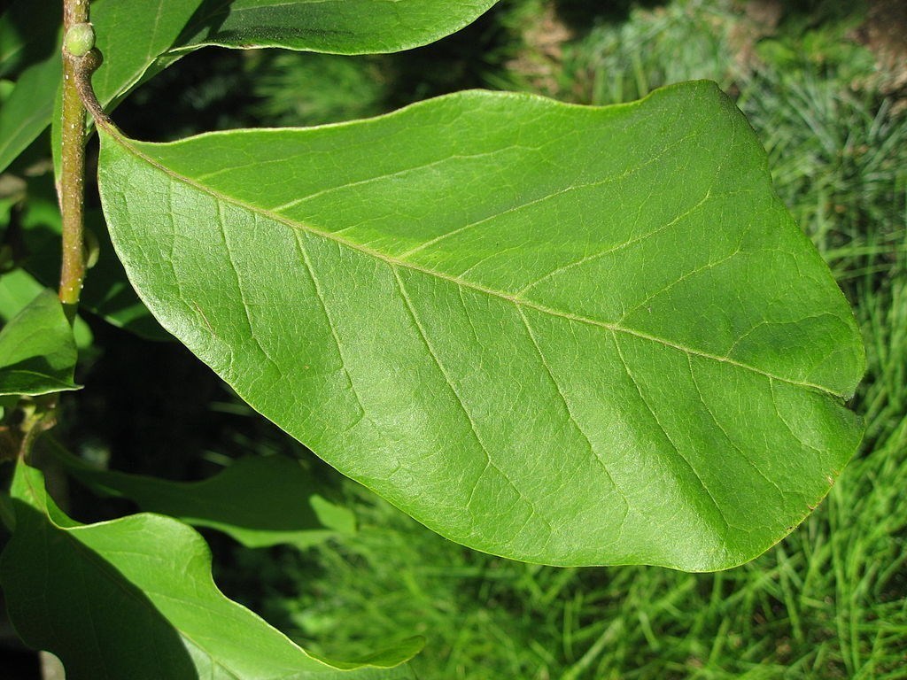 Feuille : Son feuillage est caduc. Ses feuilles sont obovales à oblongues, de couleur vert clair et mesurent 10 à 15cm.