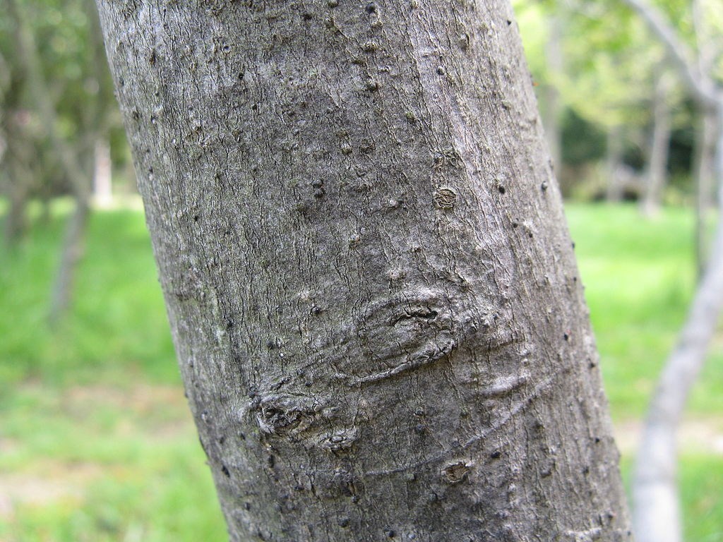 Ecorce : L’arbre possède une écorce grise avec des rameaux brun pourpres et glabres.