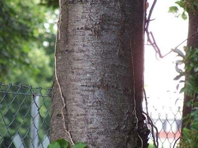 Ecorce : L’arbre possède une écorce rugueuse et se détache par lanières horizontales, luisantes et de couleur brun rougeâtre ponctuée de lenticelles.