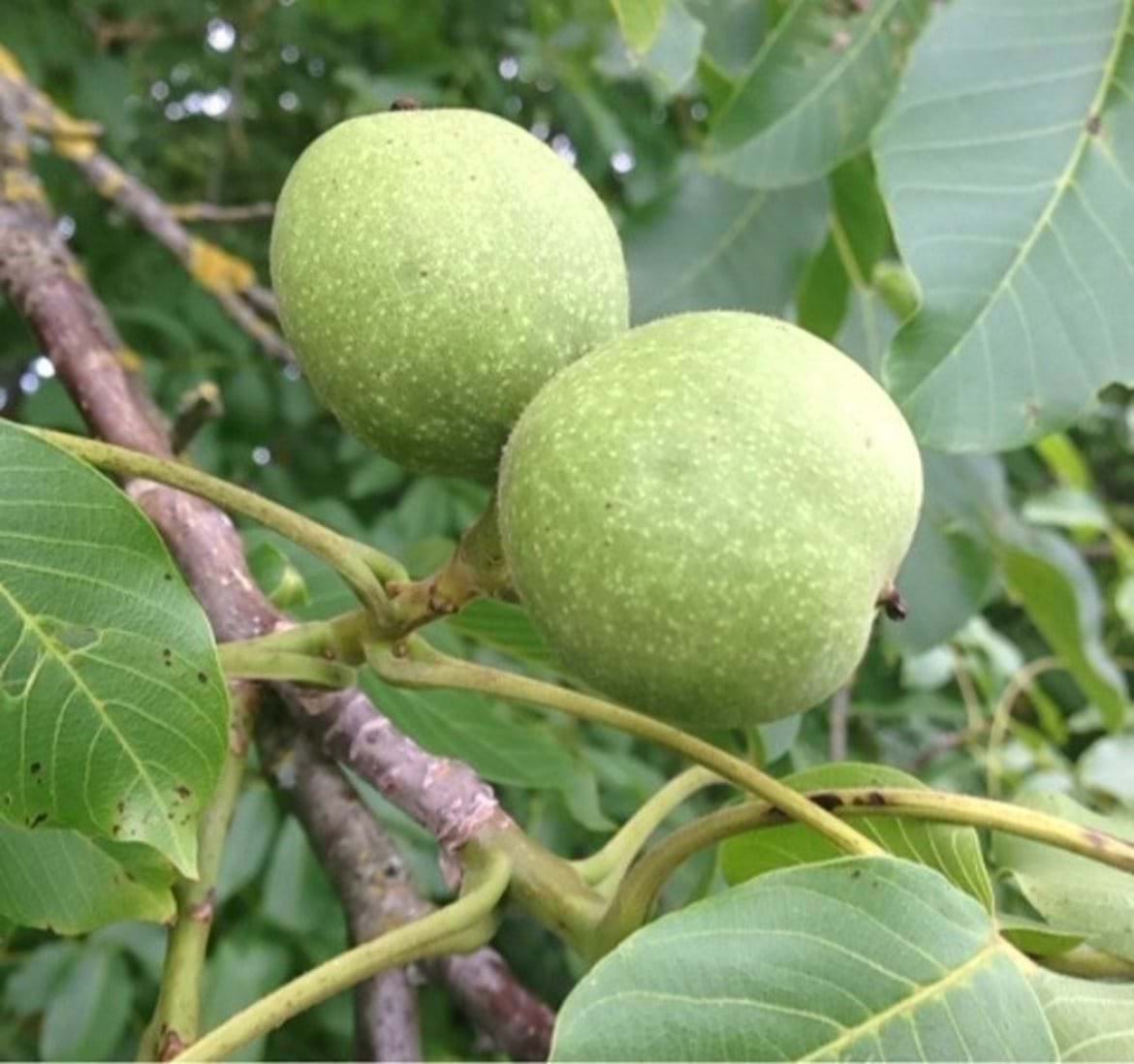 Fruits : Noix globuleuses, brunes à brou vert clair.