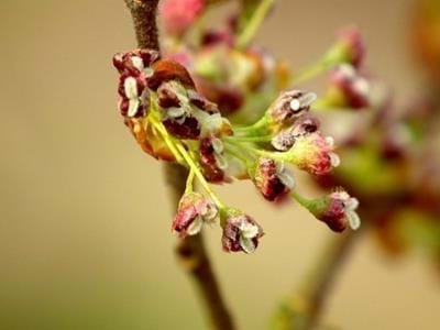 Fleurs : La floraison se déroule au printemps (mars – avril). Les fleurs sont en fascicules denses. Elles sont portées par de longs pédicelles (1 à 3 cm).