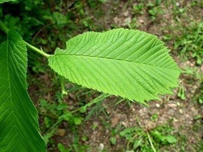 Feuille : Son feuillage est caduc. Ses feuilles sont alternes, arrondies et légèrement dissymétriques à la base, élargies vers le haut. Elles mesurent 8 à 16 cm de longueur. Les feuilles sont simples, dentelées sur le bord. Il y a trois pointes sur le sommet. La face supérieure est rugueuse. Elles sont vert clair.