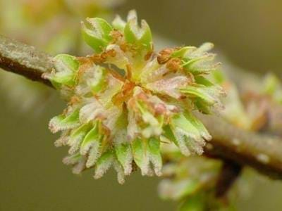 Fleurs : La floraison se déroule au printemps (mars à début avril). Les fleurs sont hermaphrodites. Elles sont en forme de bouquet et sont sessiles. De couleur rouge rosé, elles ont 4 à 6 pétales et 5 à 6 étamines.