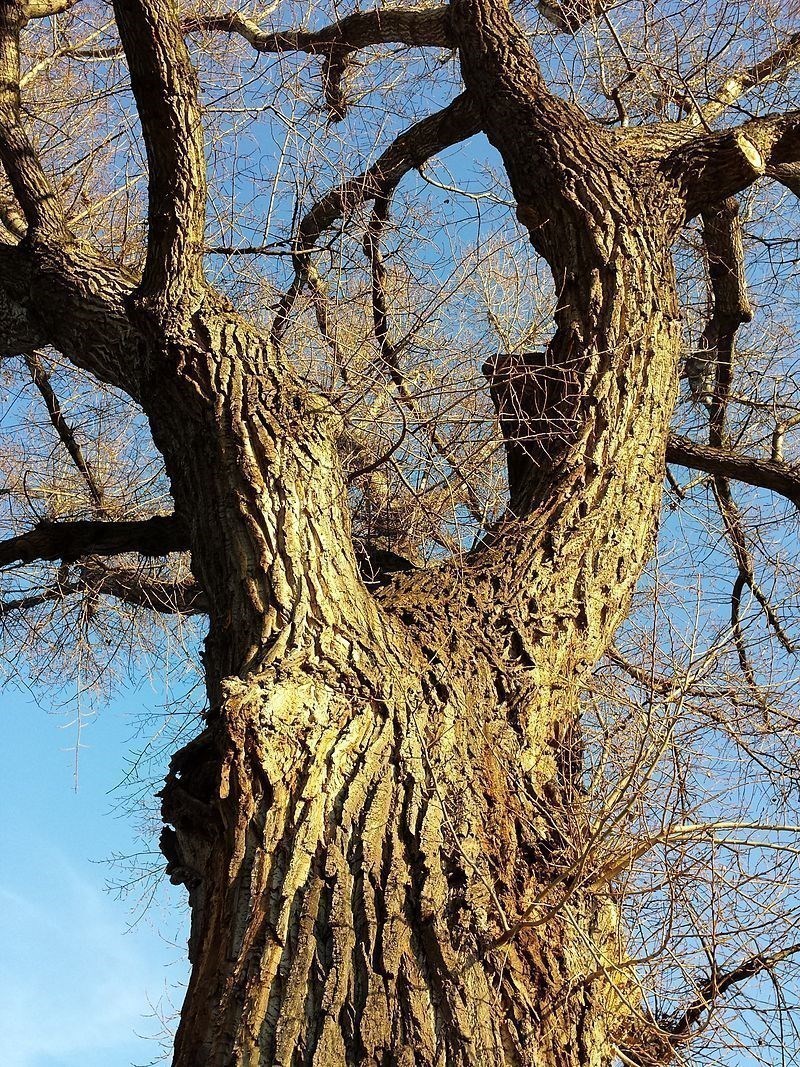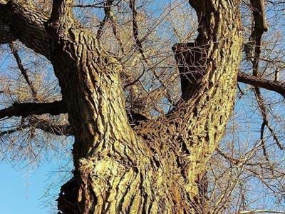 Écorce : L’arbre possède une écorce profondément crevassée d’un gris-brun noirâtre.