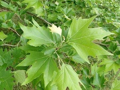 Feuille : Son feuillage est caduc. Il possède de grandes feuilles (10 à 12 cm) palmées, alternes et palmées de 5 à 7 lobes pointus et étroits. Les feuilles sont coriaces et vert vif vernissées sur le dessus. Elles deviennent rousses à l’automne.