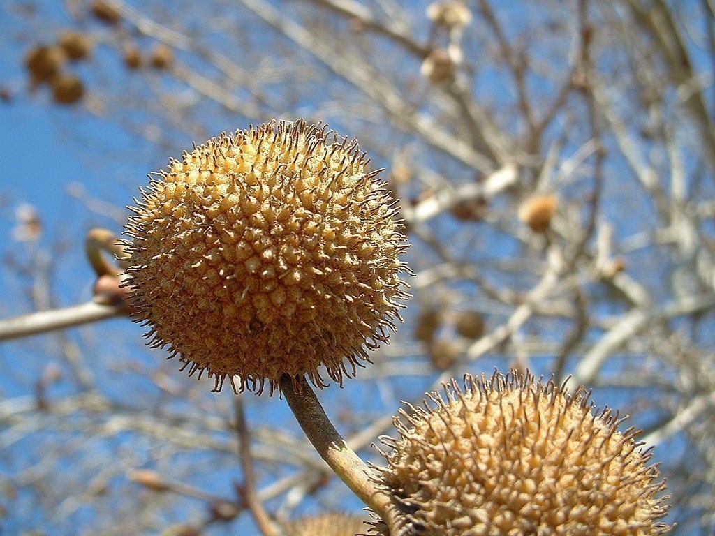 Fruits : Il s’agit d’akènes hérissés et ovoïdes d’une longueur de 2 à 5 cm. Ils sont regroupés par groupe de 3 ou 6 au bout de long pédoncule. Les fruits sont verdâtres.