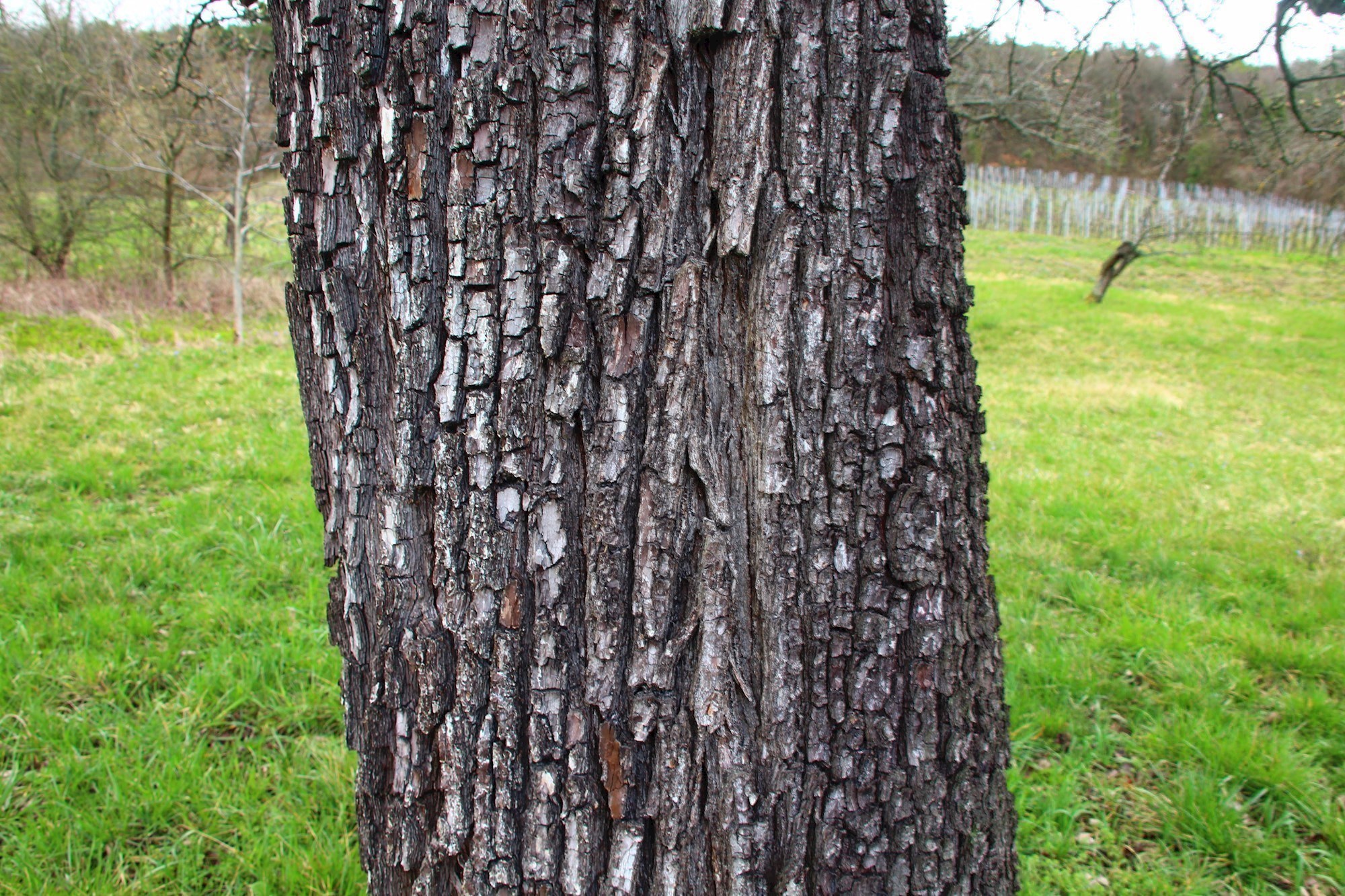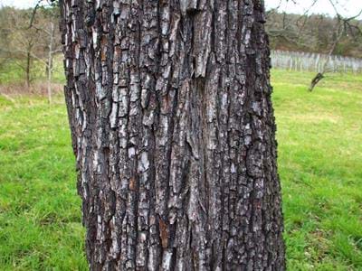 Ecorce : Au début lisse, verdâtre ou rougeâtre, puis densément fissurée, écailleuse, brun foncé.