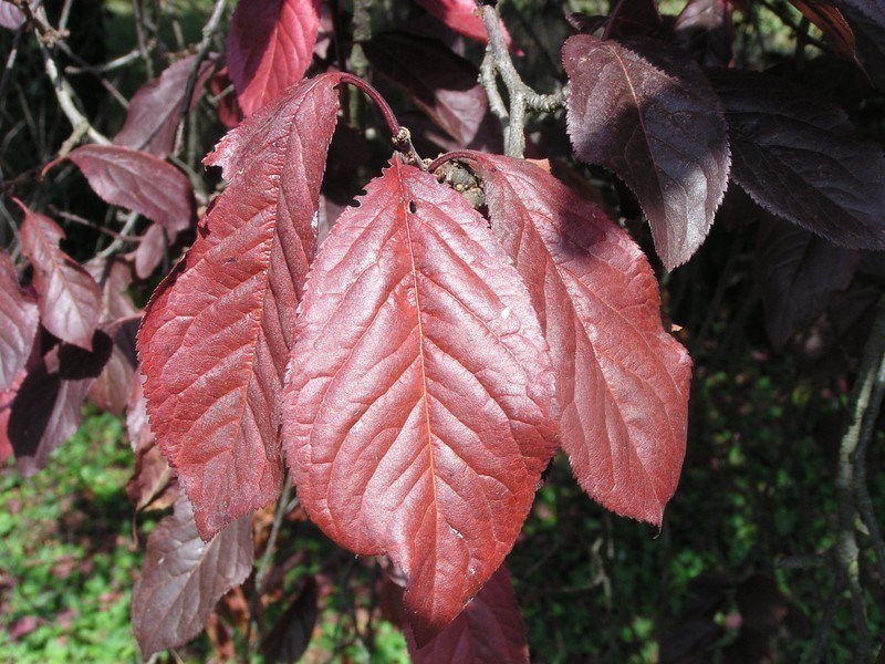 Feuille : Son feuillage est caduc. Il possède des feuilles simples de 4 à 8 cm, alternes et elliptiques à marges denticulées. Elles sont pourpres avec un revers pubescent.