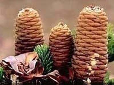 Fruits : Il s’agit d’un cône cylindrique de 10 à 20 cm de longueur pour 3 à 5 cm de largeur. Ils sont brun rougeâtre, dressés et possèdent des écailles minces avec des bractées aiguës. A maturité, des graines résineuses sont libérées. Elles sont de forme triangulaire et possèdent une large aile.