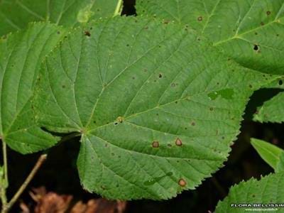 Feuille : Simples, grandes (10-15 cm), dentées, légèrement velues sur le dessus, poils blancs sur la face inférieur, en forme de cœur.