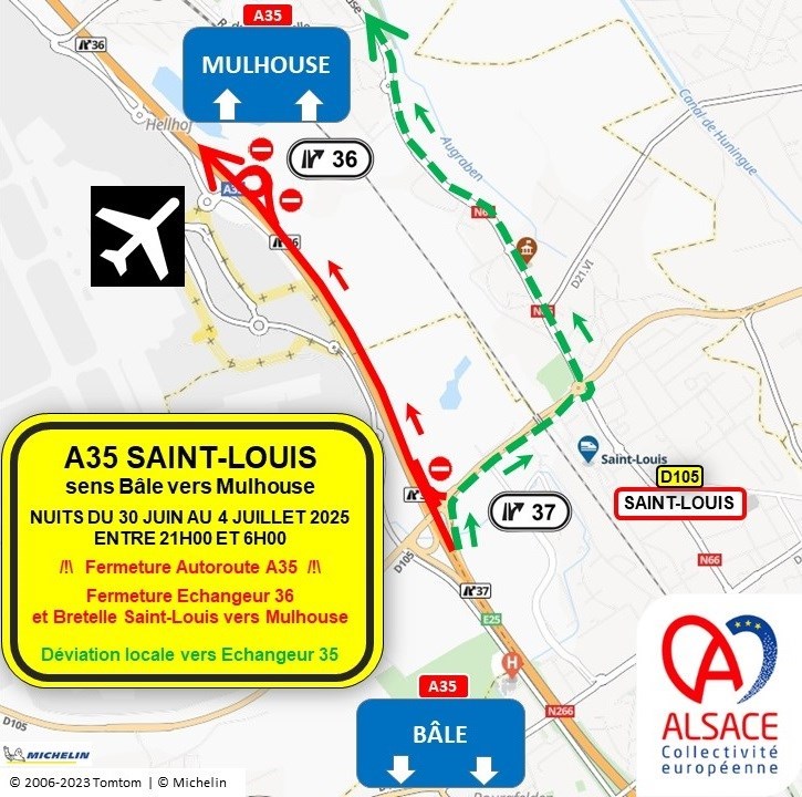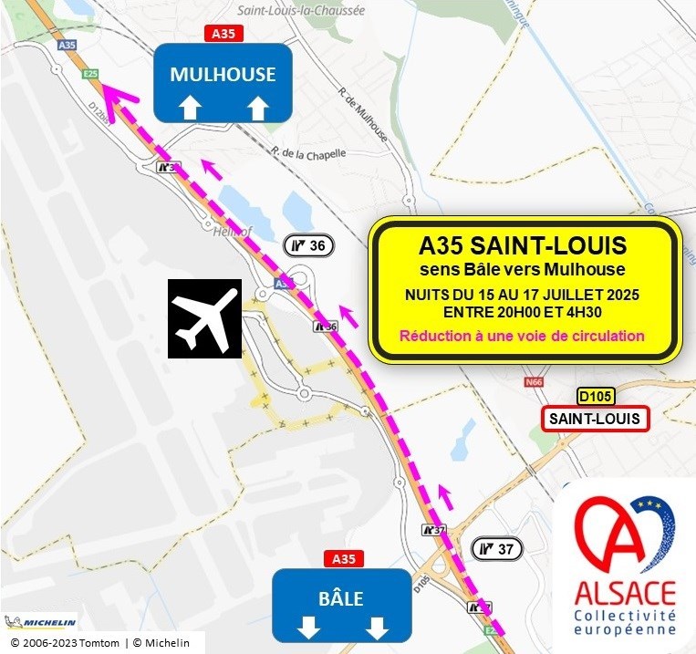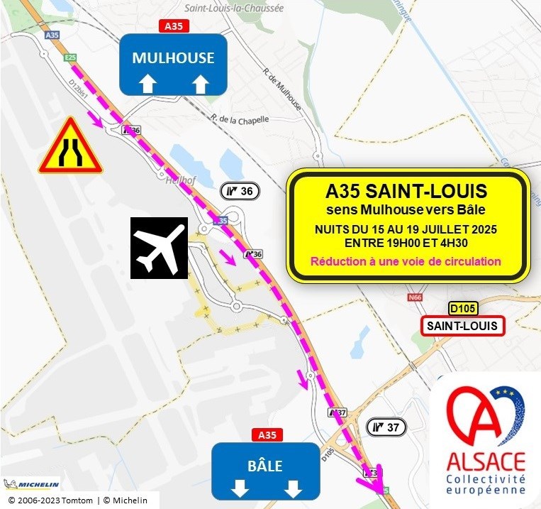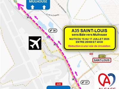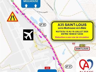 - Du lundi 16 juin au samedi 21 juin, entre 21h et 13h, la circulation sur l’A35 sera réduite à une seule voie, l’échangeur N°36 EuroAirport et la bretelle Saint-Louis vers Mulhouse à l’échangeur N°37 seront fermés, un itinéraire de déviation sera proposé par l’échangeur N°35 Bartenheim