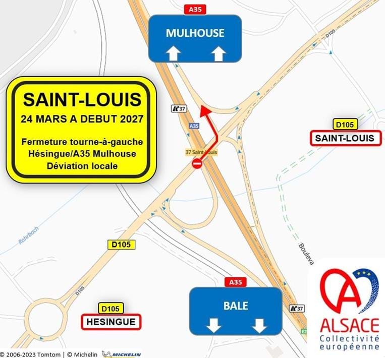 - Hésingue vers A35 Mulhouse jusqu’à début 2027 : les usagers contourneront le giratoire à proximité du cimetière et effectueront un demi-tour pour rejoindre la bretelle Saint-Louis vers A35 Mulhouse. Ce dispositif est nécessaire à l’installation du pont provisoire, un ouvrage incontournable au maintien de la circulation sur la RD105 pendant toute la durée du chantier. A défaut, il aurait fallu l’interrompre pendant 1 an !