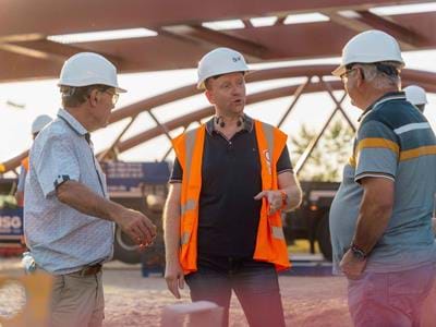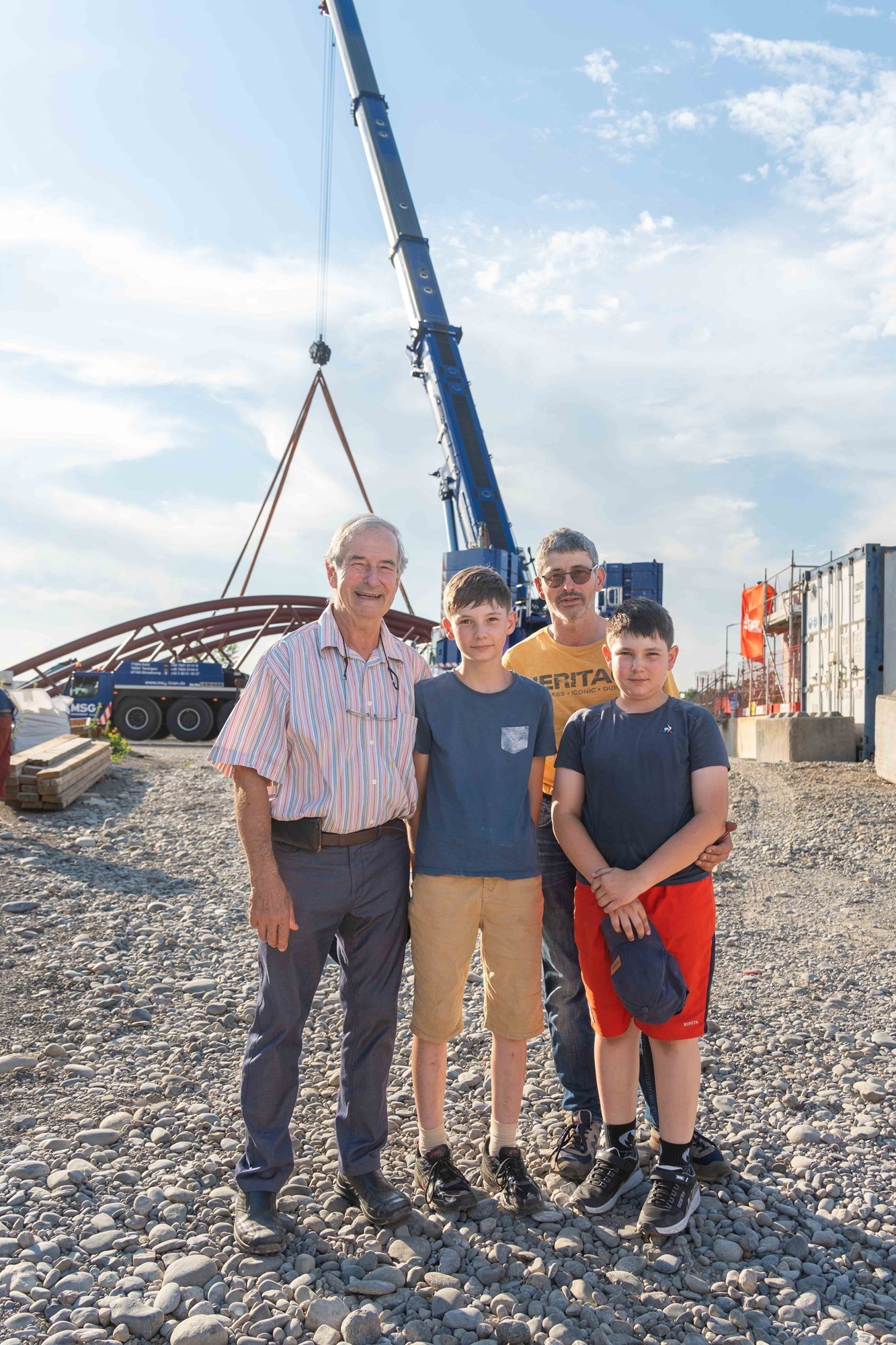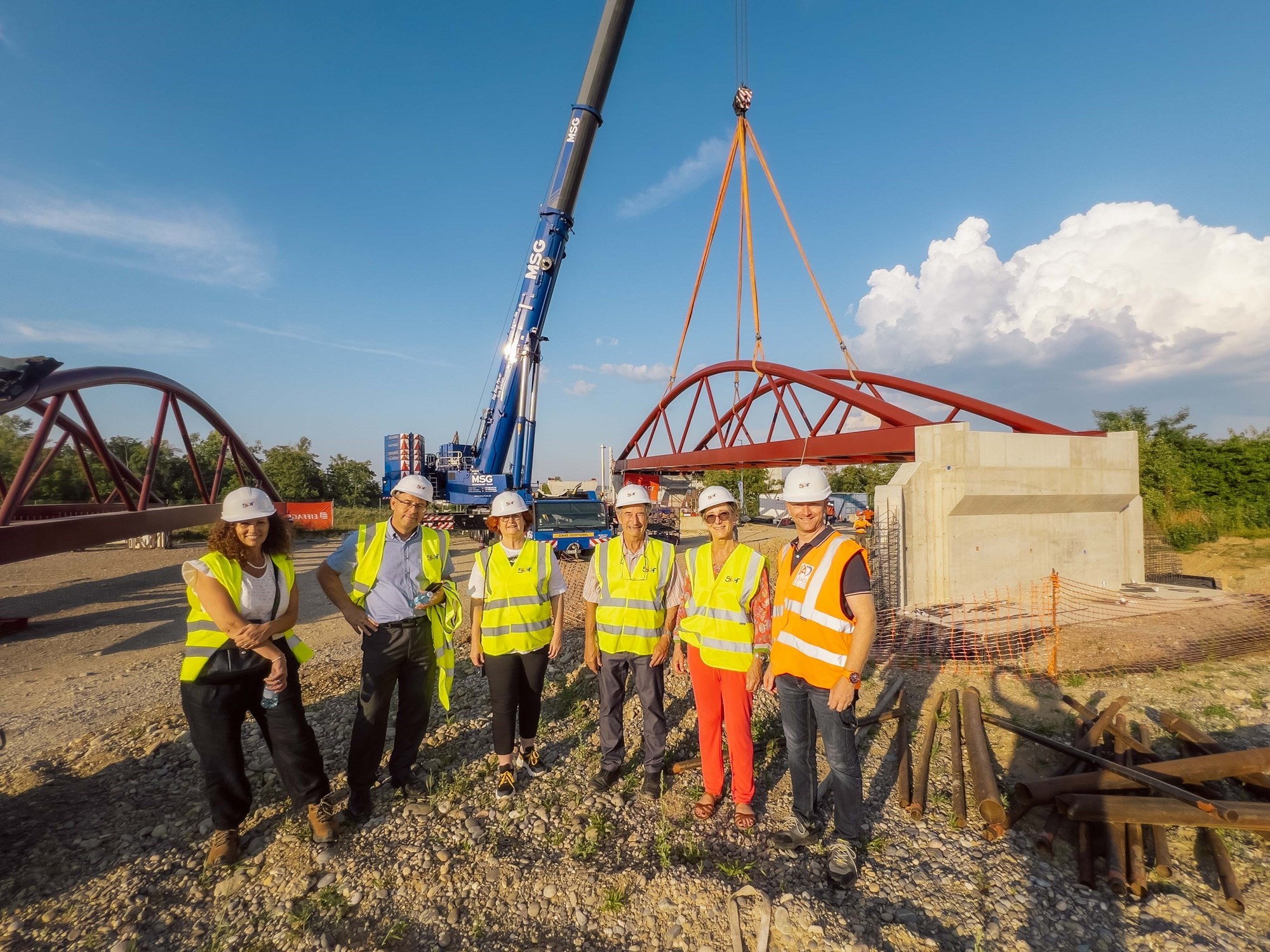 La première travée de la passerelle piétons - cyclistes a été posée le mercredi 2 juillet à Saint-Louis en présence des Conseillères d'Alsace Nicole Beha, Pascale Schmidiger, et des Conseillers d'Alsace Daniel Adrian, Thomas Zeller.