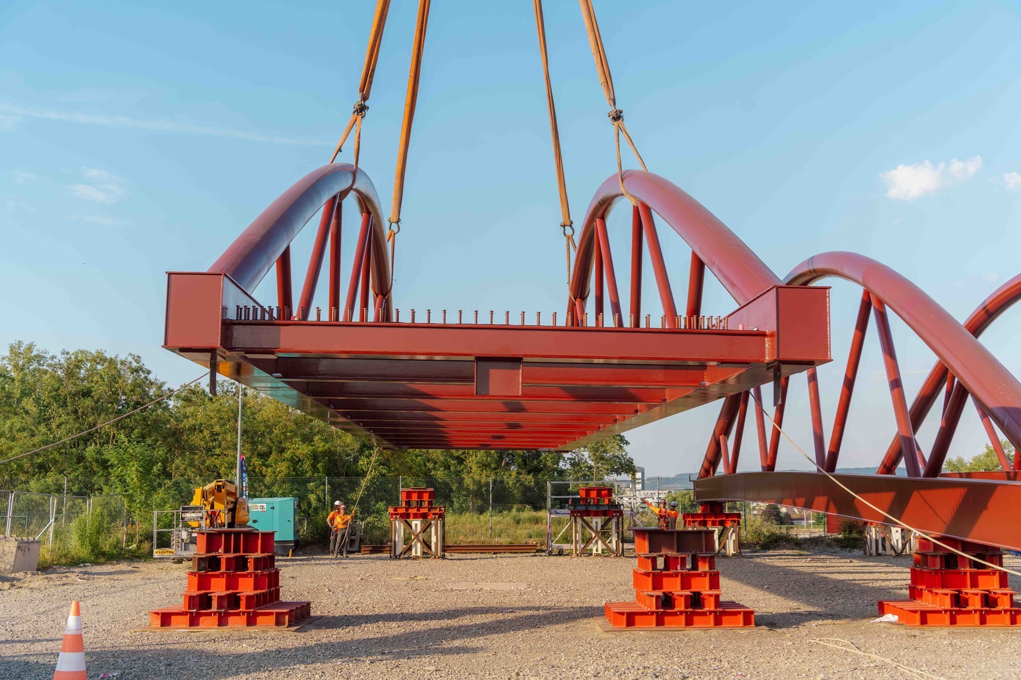 Il aura fallu 8 énormes convois exceptionnels qui ont traversés toute l’Alsace de nuit entre le 19 mai et le 19 juin pour acheminer les énormes arcs, entretoises et pièces de pont composant la charpente métallique.