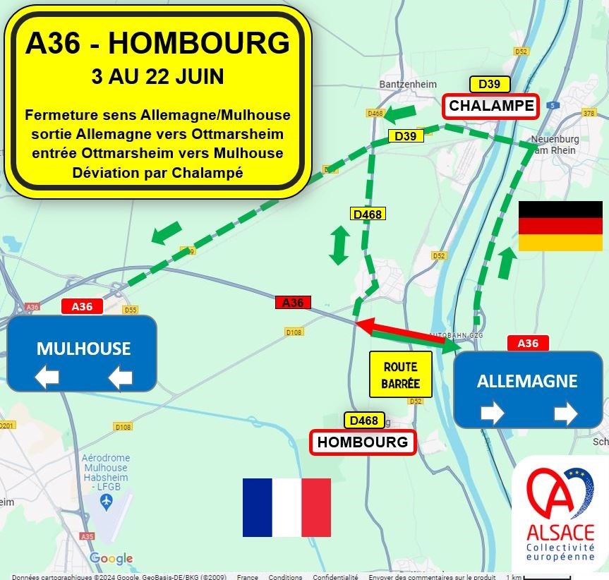 A Hombourg, la Collectivité européenne d’Alsace va procéder à des travaux d’ampleur en renouvellement de l’A36 du lundi 13 mai à 5h au dimanche 30 juin à 6h.
