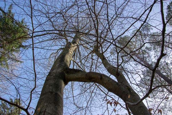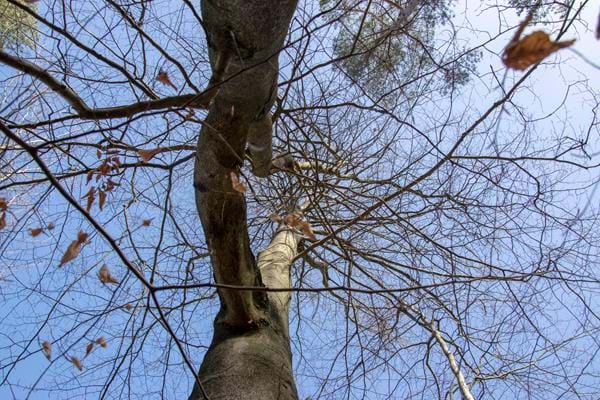 Cet hêtre commun à subit une anastomose au niveau du tronc, c'est à dire que deux hêtres originellement différents ont fusionnées par l'intermédiaire d'une branche.