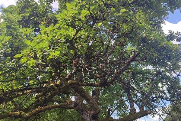 Ce gros poirier se démarque au milieu de cette prairie et des autres arbres fruitiers voisins par ses dimensions. Celui-ci représente un acceuil à la biodiversité, illustré par la présence d'un nid de frelons dans l'une des cavités de son tronc.