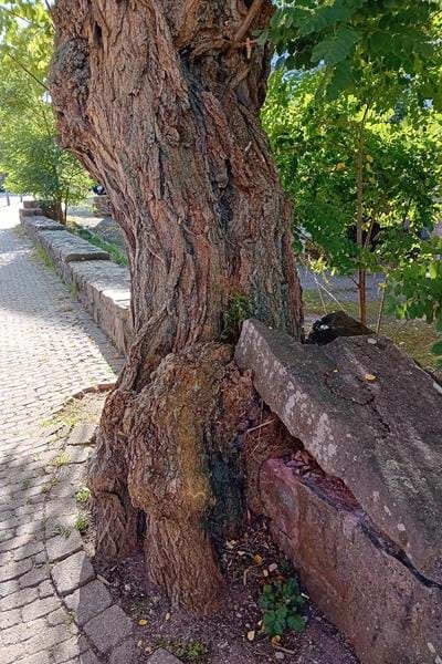 En bord de route, un beau robinier présente un port tortueux, avec un collet incrusté dans le muret longeant la route principale. Cet arbre montre des signes de sénescence, notamment au niveau du houppier.