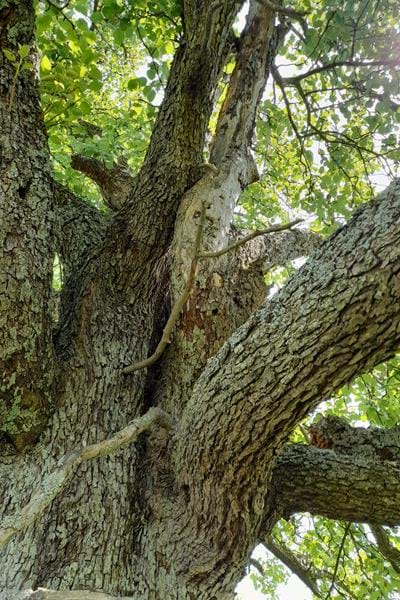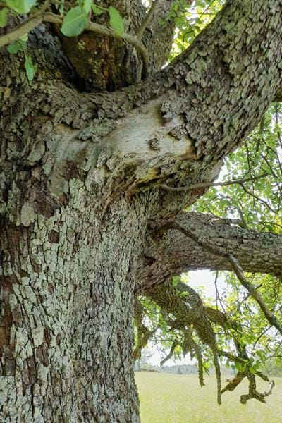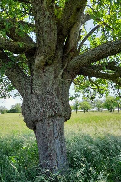 Ce pommier situé dans un verger est très ancien. Il a un bourrelet très marqué au niveau du point de greffe. Il aurait 150 ans, il a du au cours du temps permettre à des centaines de famille de profiter de délicieuses tartes aux pommes.