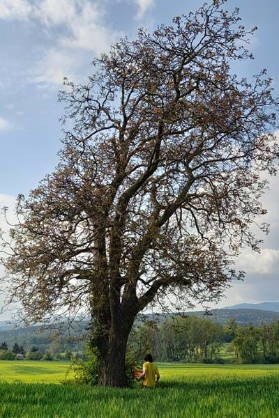 Ce noyer se trouvant proche de la route au départ d'une parcelle agricole. Permet d'apporter une multitude de nutriments et des réserve d'eau aux culture avoisinantes. Sa taille en fera dans quelques années un arbre remarquable en attendant il fait de l'ombre à des cervidés observés lors des terrains.