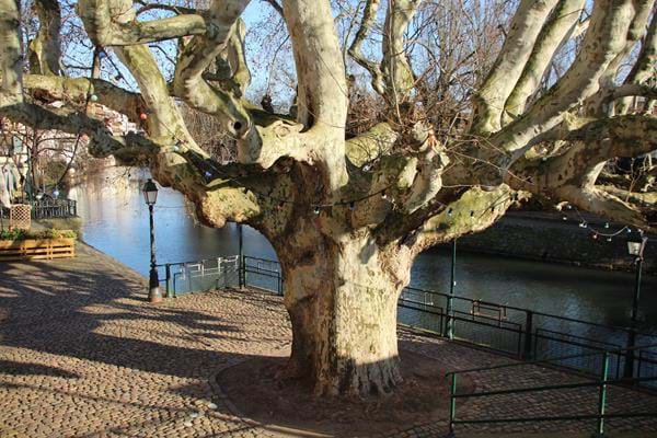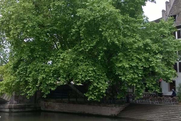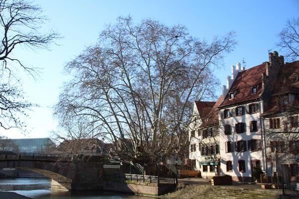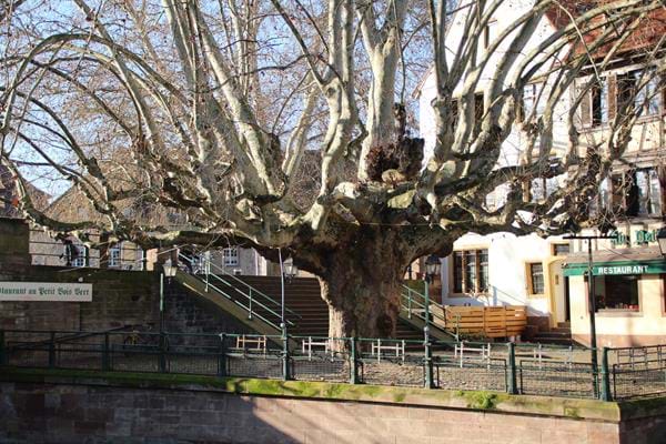 Ce platane remarquable pour ses dimensions, son âge et sa forme est bien connu des strasbourgeois et des touristes. En effet, il est situé en plein cœur du quartier de la Petite France à promixité des Ponts Couverts. Il aurait été planté sous le règne de Louis XIV, en 1704, après l'abattage d'un noyer et lui aurait ainsi succédé. La légende raconte que les musiciens montaient dans cet arbre.