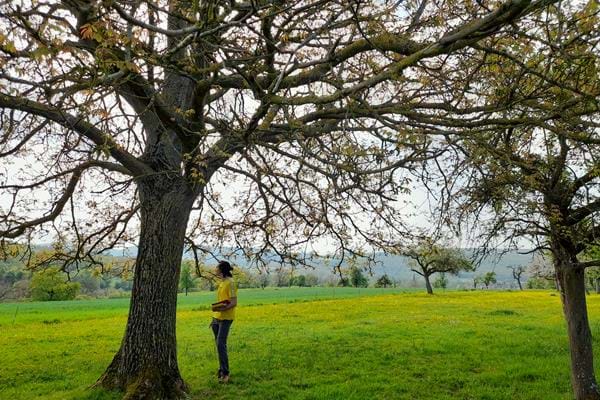Dans un verger, ce noyer est remarquable pour son esthétisme. Le noyer est cultivé pour son bois recherché en ébénisterie et ses fruits, les noix, riches en huile. C'est le seul représentant en France de la famille des Juglandacées.