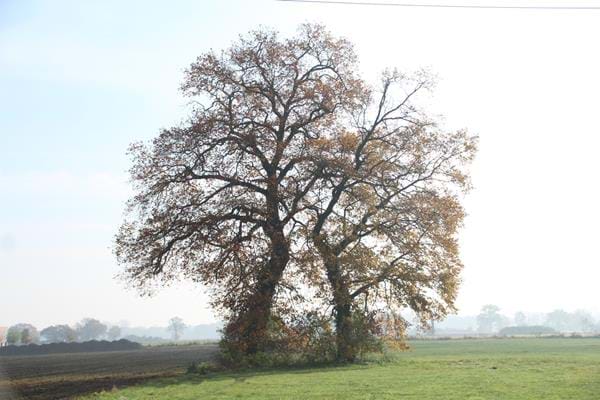 Deux chênes isolés dans un champ semblent vouloir s'embrasser.Ils sont visibles depuis l'itinéraire cyclable du canal de la Bruche à Achenheim.