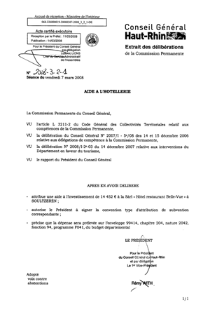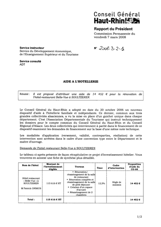 Il est proposé d'attribuer une aide de 14 452 € pour la rénovation de l'hôtel restaurant Belle-Vue à SOULTZEREN.