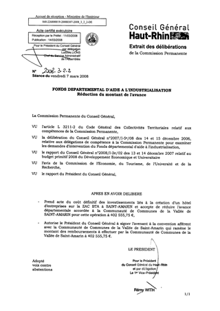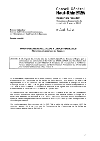 Il est proposé de prendre acte du montant définitif des travaux entrepris par la Communauté de Communes de la Vallée de SAINT-AMARIN pour la création d’un hôtel d’entreprises à SAINT-AMARIN et de réduire en conséquence le montant de l’avance départementale accordée par la Commission Permanente du 27 mai 2005 pour ramener cette avance à 402 555,75 €.