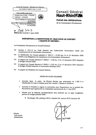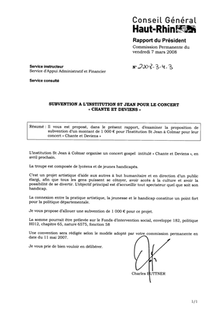 Il vous est proposé, dans le présent rapport, d’examiner la proposition de subvention d’un montant de 1 000 € pour l’Institution St Jean à Colmar pour leur concert « Chante et Deviens