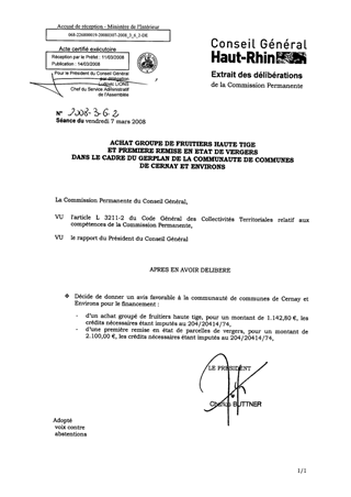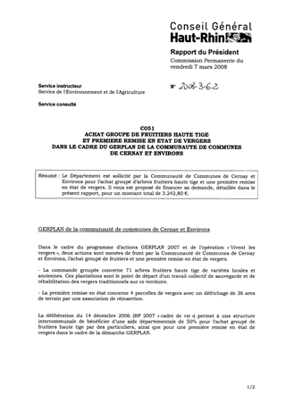 Le Département est sollicité par la Communauté de Communes de Cernay et Environs pour l’achat groupé d’arbres fruitiers haute tige et une première remise en état de vergers. Il vous est proposé de financer sa demande, détaillée dans le présent rapport, pour un montant total de 3.242,80 €.