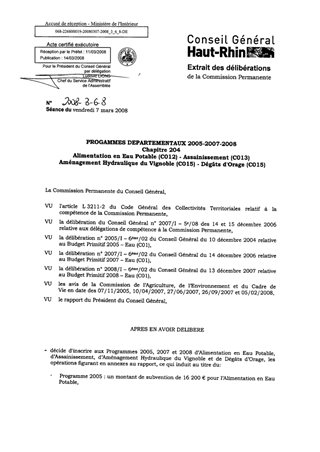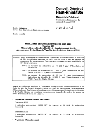 Après examen par la Commission de l'Agriculture, de l'Environnement et du Cadre de Vie, des dossiers présentés en 2005, 2007 et 2008, il vous est proposé de programmer les opérations dont l'ordre de service nous est parvenu, ce qui induit au titre des programmes: - 2005 : un montant de subvention de 16 200 € pour l’Alimentation en Eau Potable, - 2007 : un montant de subventions de 31 255 € pour l'Alimentation en Eau Potable et de 31 135 € pour l’Assainissement, - 2008 : un montant de subventions de 18 760 € pour l'Aménagement Hydraulique du Vignoble, de 128 156 € pour l’Assainissement et de 24 314 € pour les Dégâts d’Orage.