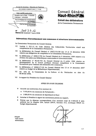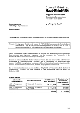 Il est proposé d'attribuer la somme de 7 970,00 € à la commune de Fortschwihr et la somme de 1 889,00 € à la commune de Spechbach-le-Haut au titre de l’aide à l’équipement mobilier et informatique de leur bibliothèque municipale.