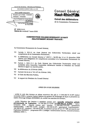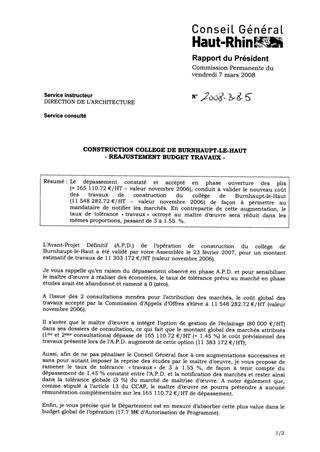 Le dépassement constaté et accepté en phase ouverture des plis (+ 165 110.72 €/HT – valeur novembre 2006), conduit à valider le nouveau coût des travaux de construction du collège de Burnhaupt-le-Haut (11 548 282.72 €/HT – valeur novembre 2006) de façon à permettre au mandataire de notifier les marchés. En contrepartie de cette augmentation, le taux de tolérance « travaux » octroyé au maître d’œuvre sera réduit dans les mêmes proportions, passant de 3 à 1.55. %.