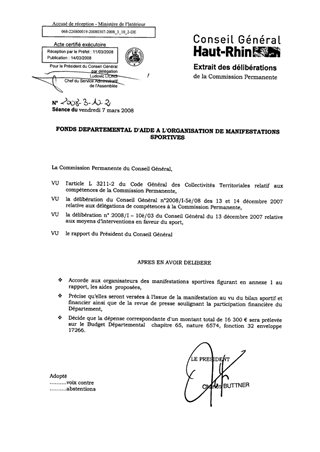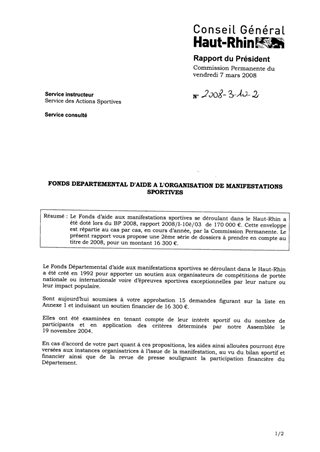 Le Fonds d’aide aux manifestations sportives se déroulant dans le Haut-Rhin a été doté lors du BP 2008, rapport 2008/I-10è/03 de 170 000 €. Cette enveloppe est répartie au cas par cas, en cours d’année, par la Commission Permanente. Le présent rapport vous propose une 2ème série de dossiers à prendre en compte au titre de 2008, pour un montant 16 300 €.