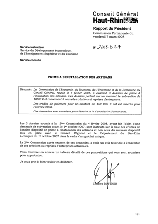 La Commission de l'Economie, du Tourisme, de l'Université et de la Recherche du Conseil Général, réunie le 4 février 2008, a examiné 3 dossiers de prime à l'installation des artisans. Ces dossiers portent sur un montant de subvention de 18800 € et concernent 3 nouvelles créations et reprises d'entreprises. Des crédits de paiement pour un montant de 450 000 € ont été inscrits pour l'exercice 2008. Ces demandes sont soumises pour décision à la Commission Permanente