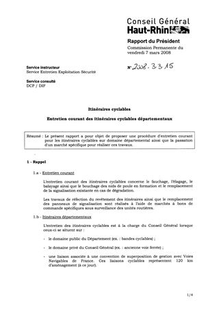 Le présent rapport a pour objet de proposer une procédure d'entretien courant pour les itinéraires cyclables sur domaine départemental ainsi que la passation d'un marché spécifique pour réaliser ces travaux.