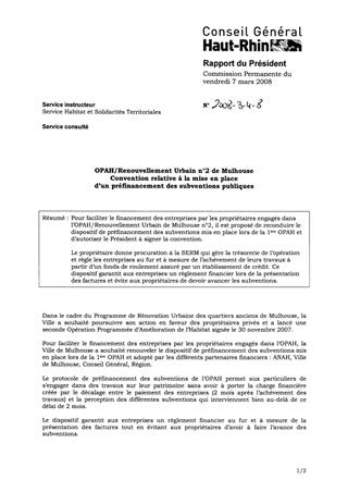 Pour faciliter le financement des entreprises par les propriétaires engagés dans l’OPAH/Renouvellement Urbain de Mulhouse n°2, il est proposé de reconduire le dispositif de préfinancement des subventions mis en place lors de la 1ère OPAH et d’autoriser le Président à signer la convention. Le propriétaire donne procuration à la SERM qui gère la trésorerie de l’opération et règle les entreprises au fur et à mesure de l’achèvement de leurs travaux à partir d’un fonds de roulement assuré par un établissement de crédit. Ce dispositif garantit aux entreprises un règlement financier lors de la présentation des factures et évite aux propriétaires de devoir avancer les subventions.