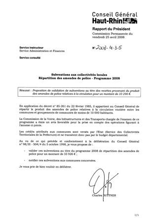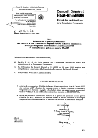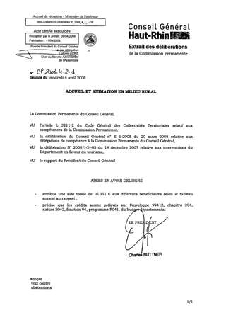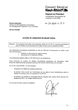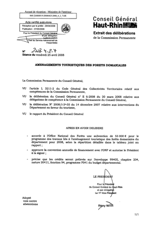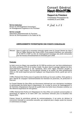 Dans le cadre de la convention triennale signée entre le Conseil Général du Haut-Rhin et l'Office National des Forêts (ONF), il est proposé d'attribuer une subvention de 55 000 € à l'ONF au titre de l'aménagement touristique des forêts domaniales pour les travaux d'investissement et d'entretien pour 2008.