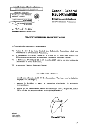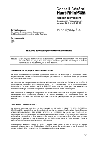 Il est proposé d'attribuer une subvention de 25 000 € à l'association "Via Jura" pour la réalisation du projet "ViaJura Regio", itinéraire pédestre, touristique et culturel reliant BALE à DELEMONT par le Jura Alsacien.
