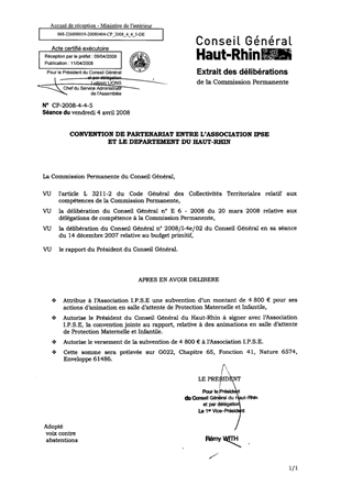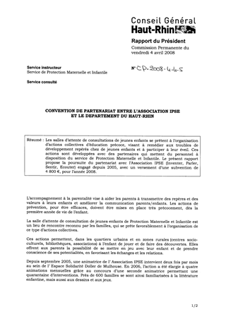 Les salles d’attente de consultations de jeunes enfants se prêtent à l’organisation d’actions collectives d’éducation précoce, visant à remédier aux troubles de développement repérés chez de jeunes enfants et à participer à leur éveil. Ces actions sont développées avec des partenaires qui mettent du personnel à disposition du service de Protection Maternelle et Infantile. Le présent rapport propose la poursuite du partenariat avec l’Association IPSE (Inventer, Parler, Sentir, Ecouter) engagé depuis 2005, avec un versement d’une subvention de 4 800 €, pour l’année 2008.