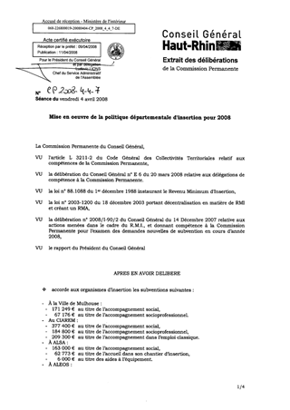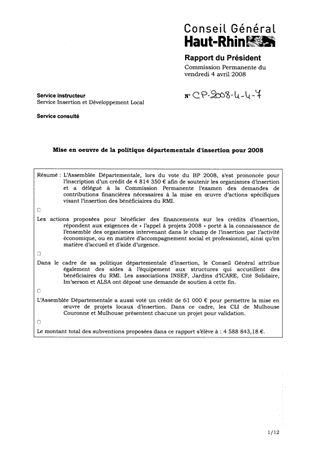 L’Assemblée Départementale, lors du vote du BP 2008, s’est prononcée pour l’inscription d’un crédit de 4 814 350 € afin de soutenir les organismes d’insertion et a délégué à la Commission Permanente l’examen des demandes de contributions financières nécessaires à la mise en œuvre d’actions spécifiques visant l’insertion des bénéficiaires du RMI. Les actions proposées pour bénéficier des financements sur les crédits d’insertion, répondent aux exigences de « l’appel à projets 2008 » porté à la connaissance de l’ensemble des organismes intervenant dans le champ de l’insertion par l’activité économique, ou en matière d’accompagnement social et professionnel, ainsi qu’en matière d’accueil et d’aide d’urgence. Dans le cadre de sa politique départementale d’insertion, le Conseil Général attribue également des aides à l’équipement aux structures qui accueillent des bénéficiaires du RMI. Les associations INSEF, Jardins d’ICARE, Cité Solidaire, Im’serson et ALSA ont déposé une demande de soutien à cette fin. L’Assemblée Départementale a aussi voté un crédit de 61 000 € pour permettre la mise en œuvre de projets locaux d’insertion. Dans ce cadre, les CLI de Mulhouse Couronne et Mulhouse présentent chacune un projet pour validation. Le montant total des subventions proposées dans ce rapport s’élève à : 4 588 843,18 €.