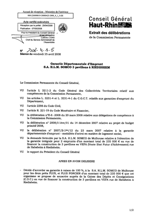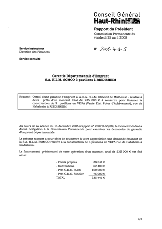Octroi d'une garantie d'emprunt à la S.A. H.L.M. SOMCO de Mulhouse - relative à deux prêts d'un montant total de 235 000 € à souscrire pour financer la construction de 3 pavillons en VEFA (Vente Etat Futur d’Achèvement), rue de Habsheim à RIEDISHEIM.