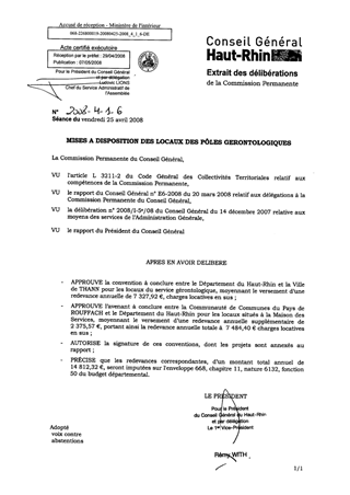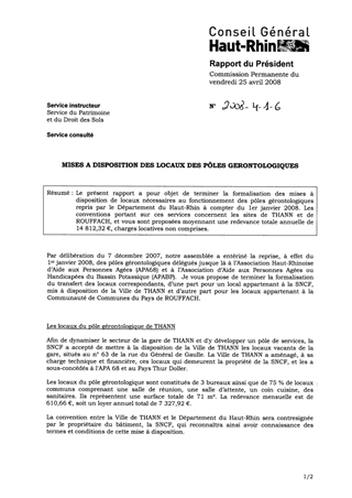 Le présent rapport a pour objet de terminer la formalisation des mises à disposition de locaux nécessaires au fonctionnement des pôles gérontologiques repris par le Département du Haut-Rhin à compter du 1er janvier 2008. Les conventions portant sur ces services concernent les sites de THANN et de ROUFFACH, et vous sont proposées moyennant une redevance totale annuelle de 14 812,32 €, charges locatives non comprises.