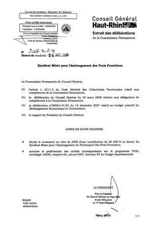 Le budget 2008 prévoit un crédit de 40 000 € en faveur du Syndicat Mixte pour l'Aménagement du Technoport des Trois Frontières. Il est proposé d'autoriser le versement de la participation départementale de 26 000 € sollicitée au titre de 2008.