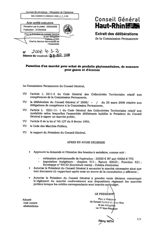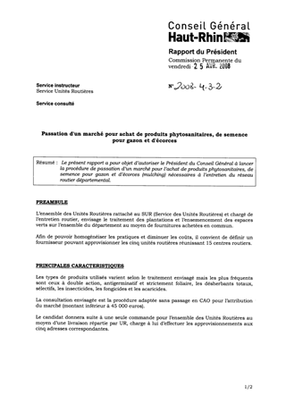 Le présent rapport a pour objet d’autoriser le Président du Conseil Général à lancer la procédure de passation d’un marché pour l’achat de produits phytosanitaires, de semence pour gazon et d’écorces (mulching) nécessaires à l’entretien du réseau routier départemental.
