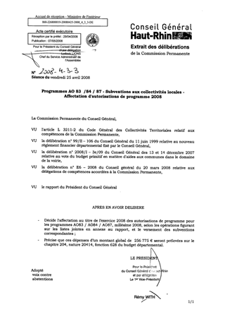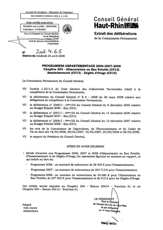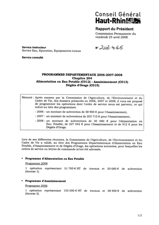 Après examen par la Commission de l'Agriculture, de l'Environnement et du Cadre de Vie, des dossiers présentés en 2006, 2007 et 2008, il vous est proposé de programmer les opérations dont l'ordre de service nous est parvenu, ce qui induit au titre des programmes: - 2006 : un montant de subvention de 58 900 € pour l'Assainissement, - 2007 : un montant de subventions de 203 715 € pour l'Assainissement, - 2008 : un montant de subventions de 20 680 € pour l'Alimentation en Eau Potable, de 227 042 € pour l'Assainissement et de 912 € pour les Dégâts d'Orage